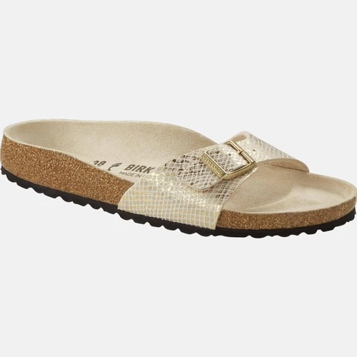 Le BIRKENSTOCK Madrid est un véritable classique qui ravit le monde de la mode avec son design minimaliste. Le gaufrage subtil en python confère à la sandale son caractère unique. De subtils effets de paillettes métalliques accentuent le look glamour. Inspirées par la nature, aucune chaussure n’a le même look et la même sensation. La tige est en microfibre douce pour la peau.