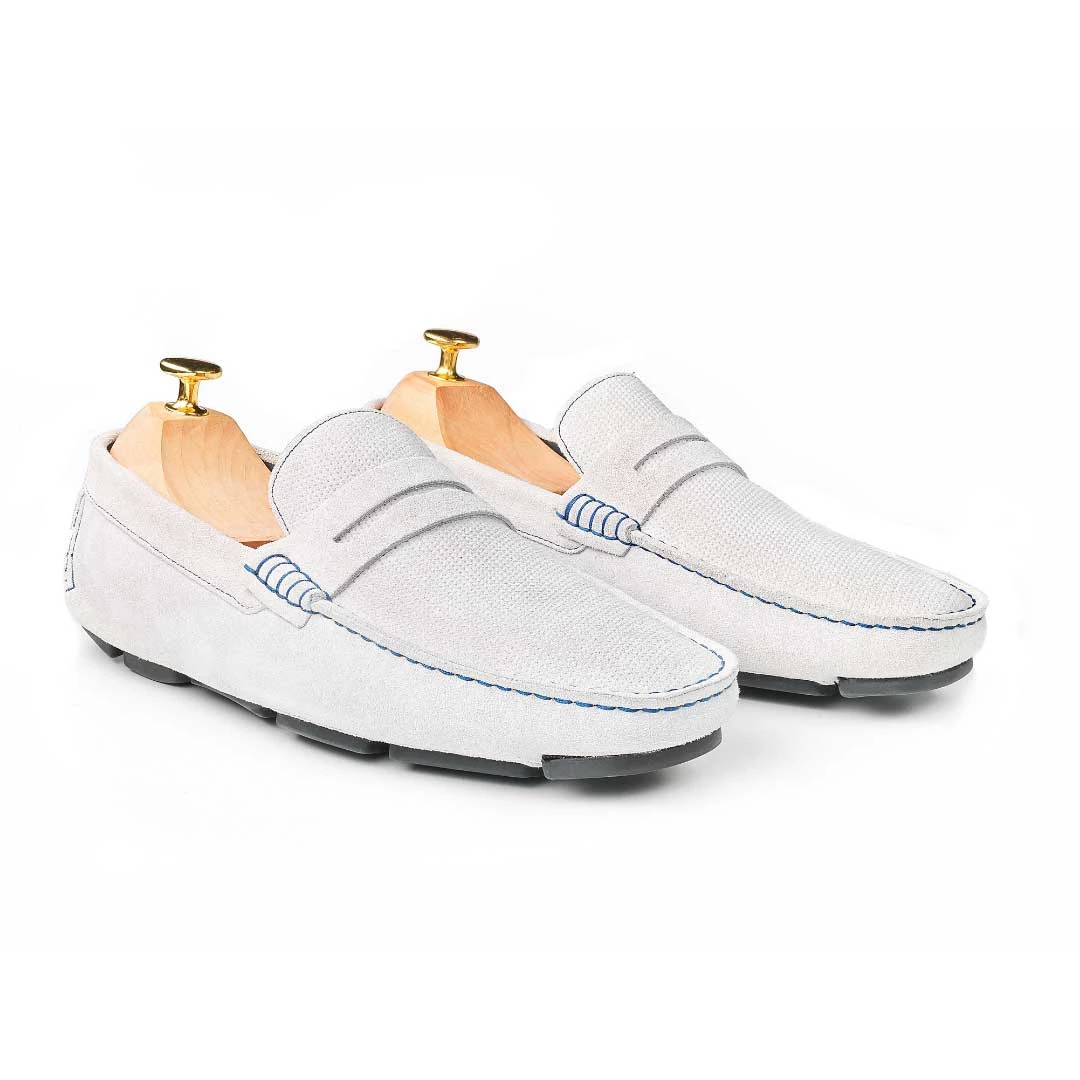 Cette paire de mocassin rappelle les couleur de Sidi bousaid un fil en bleu sur une surface blanche on se croirait presque en vacances d’été, même en étant en ville.